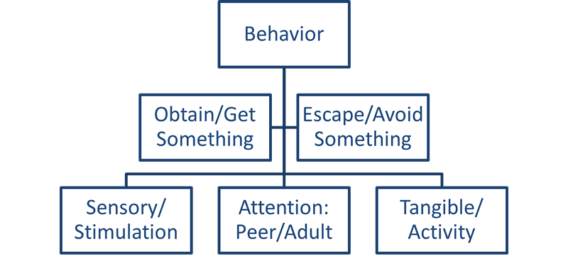 All behavior happens for a reason, it is not simply random. It serves a purpose (function) for the student who uses it. This behavior has worked in the past for the student or is working currently to achieve an outcome desired by the student. We commonly refer to these common functions of behavior with the acronym of S.E.A.T.