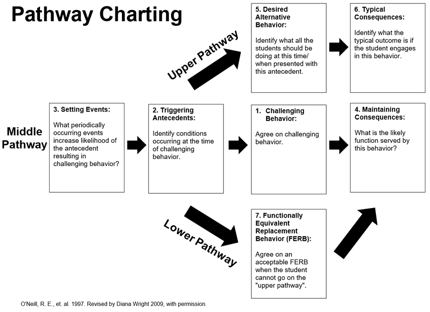 All functional behavioral assessments examine the predictors for current challenging behavior (immediate and past antecedents to the behavior) to determine what is supporting the challenging behavior as well as the maintaining consequence (function) of the behavior. The Pathway Chart summarizes those findings graphically, also visually depicting the differnet Pathways the student may go on when faced with the triggering antecedent (Upper Pathway: desired behavior, Middle Pathway: challenging behavior, Lower Pathway, Acceptable Alternative/Replacement Behavior).
